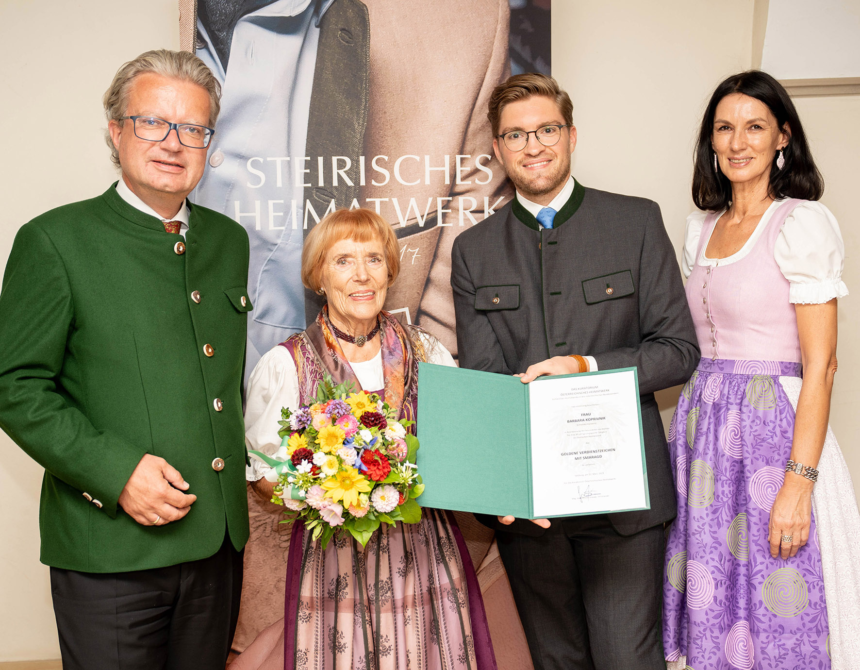 Im Zuge des Festaktes zur Eröffnung der Herrenschneiderei konnte auch die mittlerweile 85-jährige Gründerin der Damenschneiderei im Jahr 1963, Frau Barbara Koprivnik aus Klagenfurt, im Steirischen Heimatwerk begrüßt werden. In Anerkennung ihrer besonderen Verdienste um das Steirische Heimatwerk wurde ihr vom Kuratorium Österreichisches Heimatwerk unter Vorsitz von Simon Koiner-Graupp gemeinsam mit Landeshauptmann Christopher Drexler das Goldene Verdienstzeichen mit Smaragd des Österr. Heimatwerks überreicht. Barbara Koprivnik begann 1956 in der Trachtenwerkstätte des Kärntner Heimatwerk als Schneiderin zu arbeiten. Nach ihrer Übersiedelung nach Graz wurde sie vom damaligen Landeshauptmann-Stellvertreter und Kulturreferenten Hanns Koren ersucht, für das Steirische Heimatwerk eine Trachtenwerkstätte für Dirndl aufzubauen. Mit ihrem Fachwissen begründete Barbara Koprivnik 1963 die Damenschneiderei für das Steirische Heimatwerk, baute diese in den kommenden Jahren schrittweise aus und leitete sie bis zu ihrer Pensionierung 1992.